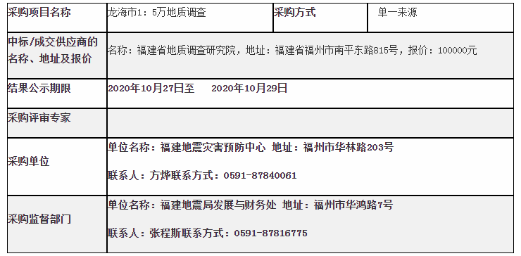 地震災害預防中心龍海市1:5萬地質調查采用單一來源采購結果公告