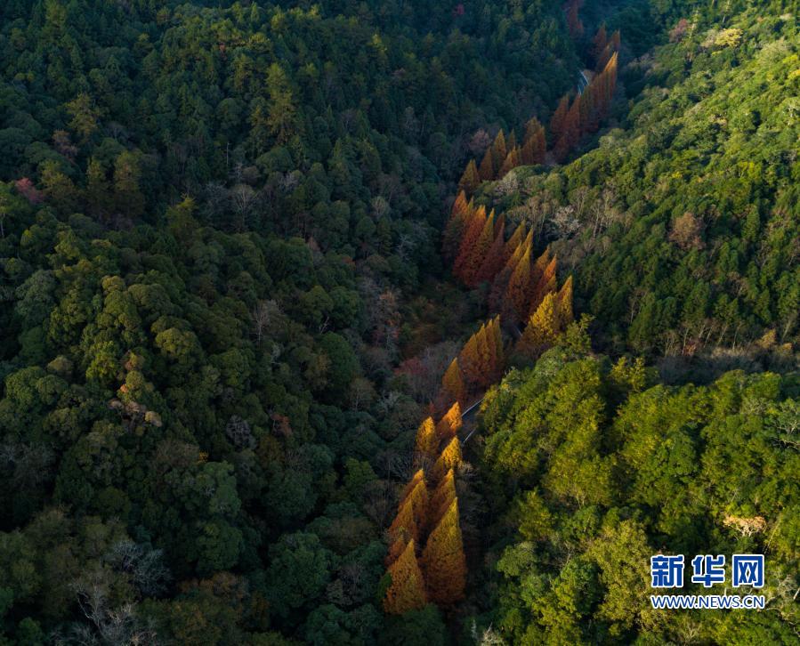 這是11月19日拍攝的福建省三明市將樂縣國家級自然保護區水杉大道(無人機照片)。 龍棲山國家級自然保護區位于福建省三明市將樂縣。近年來,該縣利用當地得天獨厚的生態條件,發展全域森林康養產業,并于今年6月入選首批國家森林康養基地名單。新華社記者 宋為偉 攝