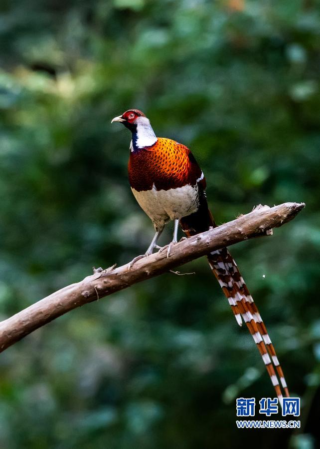 在永安市青水畬族鄉豐田村,一只白頸長尾雉在樹干上休憩(11月20日攝)。新華社記者 梅永存 攝