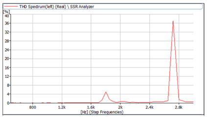 本次諧波失真全部滿足標準要求,但是并非所有滿足標準要求的耳機主觀聽感就好,這是由于標準中允許小于三分一倍頻程的失真峰存在。例如下圖中,雖然諧波失真滿足標準要求,但是失真峰最高達到了36%,如果音樂頻段集中在這個頻段,主觀聽音效果是非常差的。