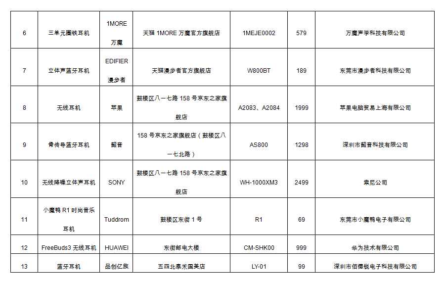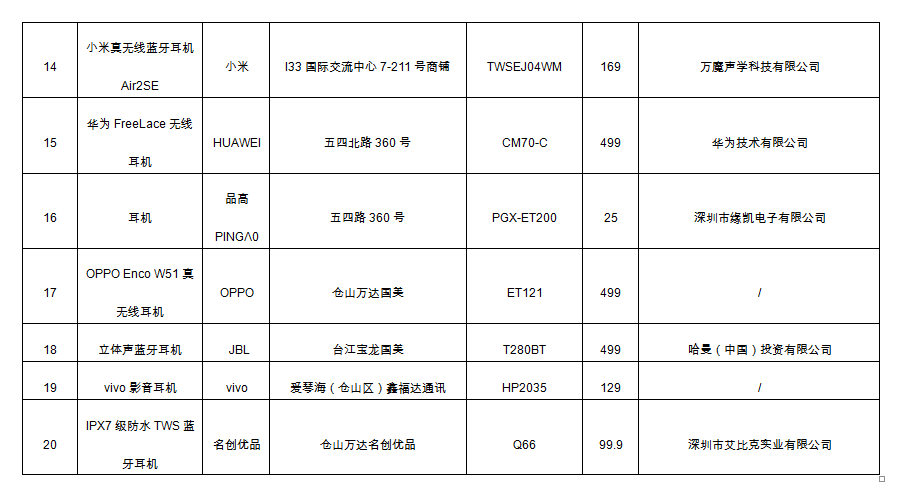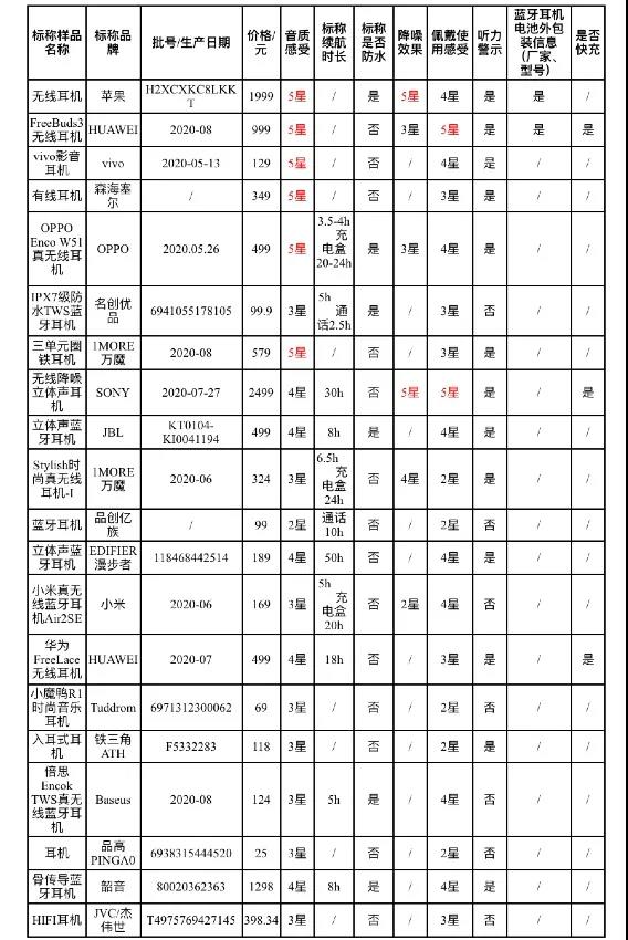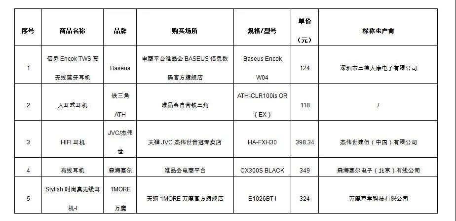 近期,福建省消委會聯合福建省產品質量檢驗研究院的工作人員以普通消費者的身份在福州市部分大型綜合商貿體、校園周邊地區、以及線上銷售平臺購買了不同類型、不同品牌的20款耳機產品,圍繞消費者關注的產品安全和感觀體驗進行了比較試驗。 一、基本情況 本次耳機產品比較試驗對樣品的最大聲壓級、仿真節目信號特性電壓、總諧波失真、恒定濕熱、聽音檢驗、音質感受、降噪效果、佩戴使用感受等進行了測評。采樣對象基本涵蓋市面上主流品牌,品牌涉及Baseus、鐵三角ATH、JVC/杰偉世、森海塞爾、1MORE萬魔、EDIFIER漫步者、蘋果、韶音、SONY、Tuddrom、HUAWEI、品創億族、小米、品高PINGΛ0、OPPO、JBL、vivo、名創優品。耳機類型包含頭梁式、懸掛式和耳塞式等,其中電商平臺7款,線下實體店13款,共計20款產品,價格在25元-2499元之間。 福建省消委會委托福建省產品質量檢驗研究院依據國家相關標準以及經備案現行有效的或網上聲明公開的企業標準及產品明示質量指標和要求或其他相適應產品標準對樣品進行檢測,并組織部分志愿者對耳機產品進行了感觀評測。 表一:樣品基本情況 (點擊圖片放大查看)