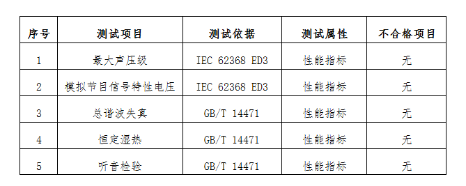 二、檢驗標準及項目 本次比較試驗樣品委托福建省產品質量檢驗研究院以GB/T 14471-2013 《頭戴耳機通用規范》等標準,對樣品聽音檢驗、最大聲壓級、模擬節目信號特性電壓、總諧波失真、恒定濕熱試驗5個項目進行測試。比較試驗結果僅對購買的樣品負責,不代表同品牌不同批次、不同型號商品的質量狀況。 三、比較試驗結果分析 從本次耳機產品比較試驗情況來看,20款樣品全部符合相關標準要求。具體如下: 表二(點擊圖片放大查看)