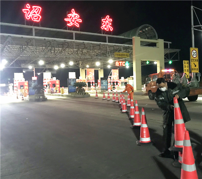 深夜,洪葵在收費廣場進行錐筒渠化布控 投稿單位供圖