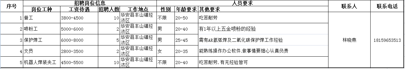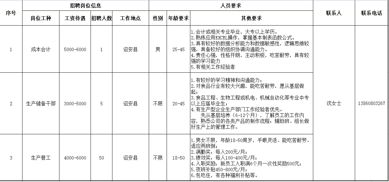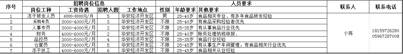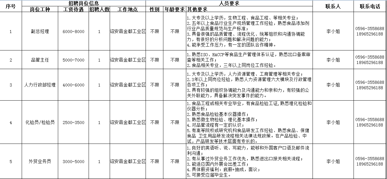 招聘企業信息如下: (可下載表格查看詳細信息) 一、福建合口味食品工業有限公司 企業簡介:福建合口味食品工業有限公司依托于深圳市合口味食品有限公司平臺,2009年斥資1.2億在富有“中國海峽硒都”、“長壽之鄉”美譽的福建詔安建立生產基地,基地工業園占地205畝,生產車間4萬平方平。公司始終秉承“真愛真品質”的企業理念、“愛心賦食品、食品如人品”的經營理念,主要生產包子、饅頭、花卷、云吞、水餃、湯圓、粽子等冷鮮速凍食品。以無添加香精色素為生產標準,以中國傳統餐廚美食工業化為己任,追求速凍冷鮮食品研發與技術革新,并在行業內率先通過SGS-ISO22000管理體系認證。榮獲“深圳市農業龍頭企業”、“首屆深圳老字號企業”、“福建省農業產業化龍頭企業”、“詔安納稅大戶”等榮譽稱號。 企業地址:福建詔安縣深橋鎮雨亭168號