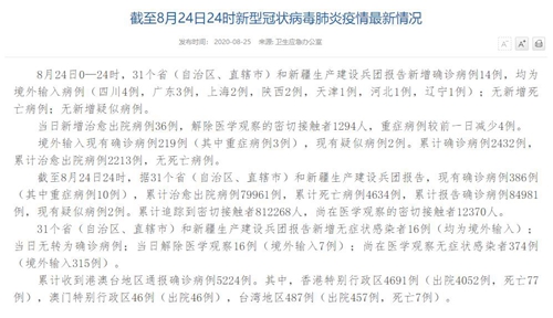 人民網北京8月25日電(董童)國家衛生健康委于今日在官網發布的《截至8月24日24時新型冠狀病毒肺炎疫情最新情況》(以下簡稱“情況”)提出,8月24日0—24時,31個?。ㄗ灾螀^、直轄市)和新疆生產建設兵團報告新增確診病例14例,均為境外輸入病例(四川4例,廣東3例,上海2例,陜西2例,天津1例,河北1例,遼寧1例);無新增死亡病例;無新增疑似病例。當日新增治愈出院病例36例,解除醫學觀察的密切接觸者1294人,重癥病例較前一日減少4例。
