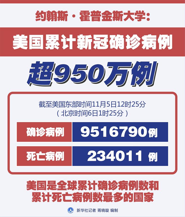 約翰斯·霍普金斯大學:美國累計新冠確診病例超950萬例