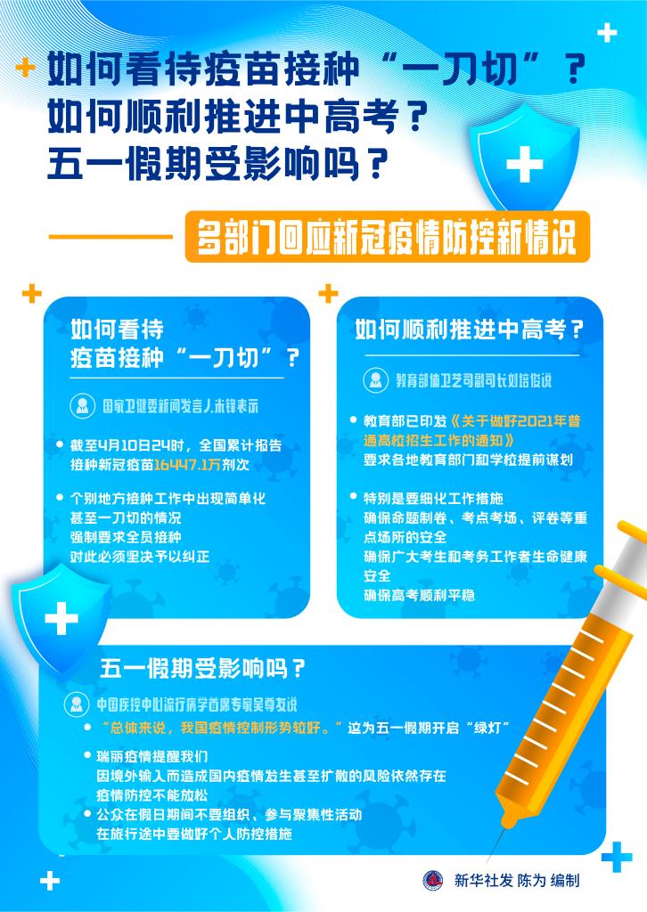 新華社北京4月11日電 題:如何看待疫苗接種“一刀切”?如何順利推進中高考?五一假期受影響嗎?——多部門回應新冠疫情防控新情況