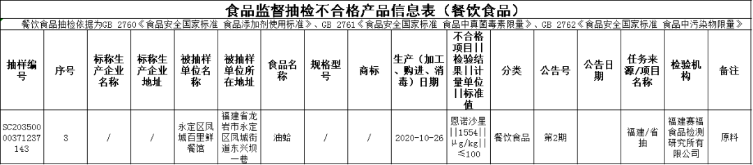 農獸藥殘留問題 ◆永定區鳳城百里鮮餐館銷售的油蛤(購進日期為2020年10月26日),恩諾沙星不合格,檢驗機構為福建賽福食品檢測研究所有限公司; ◆泉州新華都購物廣場有限公司晉江磁灶店銷售的草鱺魚(購進日期為2020年8月11日),呋喃唑酮代謝物不合格、氧氟沙星不合格,初檢機構為漳州海關綜合技術服務中心,復檢機構為廈門海關技術中心; ◆中閩百匯(中國)零售集團有限公司晉江橋南分公司銷售的冰鮮海鱸魚(購進日期為2020年8月8日),恩諾沙星不合格,初檢機構為漳州海關綜合技術服務中心,復檢機構為福州海關技術中心; ◆漳州新華都百貨有限責任公司元光店銷售的土雞蛋(購進日期為2020年8月17日),氟苯尼考不合格,初檢機構為廈門海關技術中心,復檢機構為福建省產品質量檢驗研究院; ◆泉州市洛江區萬安??吐〕袖N售的上海青(購進日期為2020年8月24日),毒死蜱不合格,初檢機構為廈門海關技術中心,復檢機構為福建中檢華日食品安全檢測有限公司; ◆漳州新華都百貨有限責任公司丹霞店銷售的油蛤(購進日期為2020年8月25日),恩諾沙星不合格,初檢機構為漳州海關綜合技術服務中心,復檢機構為福建中檢華日食品安全檢測有限公司; ◆福建永輝超市有限公司莆田市水韻城店銷售的草鱺(購進日期為2020年8月26日),氧氟沙星不合格,初檢機構為漳州海關綜合技術服務中心,復檢機構為福州海關技術中心; ◆福建誼品弘閩科技有限公司倉山觀海路分公司銷售的長江鯽魚(購進日期為2020年9月17日),恩諾沙星不合格,檢驗機構為漳州海關綜合技術服務中心; ◆福建永輝超市有限公司莆田市荔城區黃石鎮晴嵐店銷售的草鱺(購進日期為2020年8月27日),氧氟沙星不合格,初檢機構為漳州海關綜合技術服務中心,復檢機構為福建省產品質量檢驗研究院; ◆羅源縣金源瑞都超市有限公司銷售的多寶魚(購進日期為2020年9月12日),恩諾沙星不合格、氧氟沙星不合格,檢驗機構為漳州海關綜合技術服務中心; ◆廈門樂海百貨有限公司綠苑購物中心銷售的非洲鯽魚(購進日期為2020年9月14日),恩諾沙星不合格,初檢機構為漳州海關綜合技術服務中心,復檢機構為福州海關技術中心; ◆泉州新華都購物廣場有限公司湖心店銷售的雞腿(購進日期為2020年8月26日),呋喃西林代謝物(SEM)不合格,初檢機構為廣州廣電計量檢測股份有限公司,復檢機構為福建省產品質量檢驗研究院; ◆福建冠業投資發展有限公司漳平圣宇廣場店銷售的龍膽魚(購進日期為2020年10月21日),呋喃唑酮代謝物不合格,檢驗機構為漳州海關綜合技術服務中心; ◆長泰縣寶國海產品攤銷售的鱸魚(購進日期為2020年10月28日),氯霉素不合格,檢驗機構為漳州海關綜合技術服務中心; ◆新羅區阿妹海產品攤銷售的明蝦(購進日期為2020年10月28日),呋喃唑酮代謝物不合格,檢驗機構為漳州海關綜合技術服務中心; ◆沙縣農興海鮮超市銷售的龍膽魚(購進日期為2020年10月28日),呋喃唑酮代謝物不合格,檢驗機構為漳州海關綜合技術服務中心。