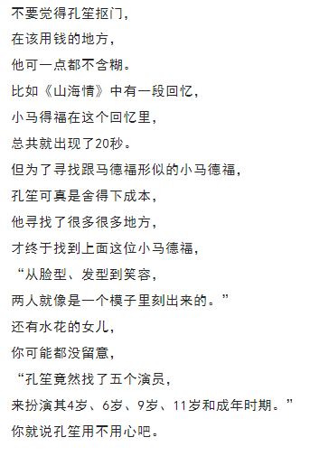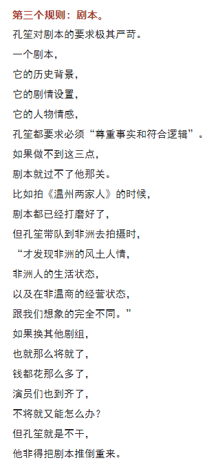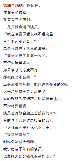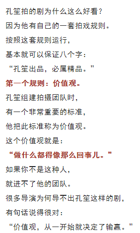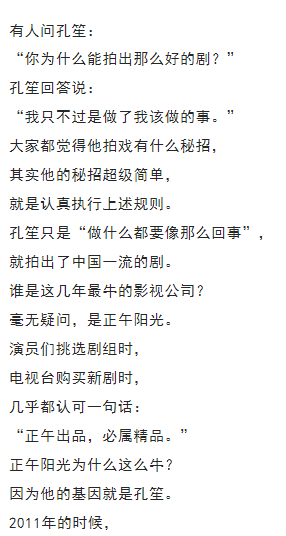 孔笙帶著幾名弟子離開山東影視集團, 然后創辦了東陽正午陽光影視公司。 在正午陽光這個團隊里, 大家也都認可一句話: “制片人候鴻亮是事務性領袖, 而導演孔笙是精神領袖?!?/span> 正午陽光能拍出那么多好劇, 就是因為他們“做什么都像那么回事”。 他們沒有什么大秘招, 他們的秘招就是“做了我們該做的事”。 10 我這次寫孔笙這個人物, 既沒有寫他的性格, 也沒有寫他的生活, 甚至放棄了寫他的成長和經歷, 只是寫了他拍戲的態度。 我為何要選擇這個寫作角度呢? 因為我覺得現在中國影視行業, 最欠缺的東西就是這個。 大家都想著怎么才能賺快錢, 而愿意腳踏實地做事的人實在是太少了。 但孔笙的成功、正午陽光的成功, 恰好證明了一個道理: 這世上并沒有什么捷徑, 最快的捷徑就是腳踏實地做事情。 貝弗利·希爾斯說得好: “這世上任何值得去的地方,都沒有捷徑?!?/span>