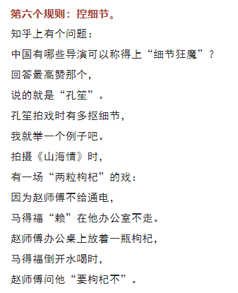 這場戲最初的版本是: 趙師傅主動問馬得福: “要枸杞不? 不要放太多,兩三粒就行?!?/span> 馬得福要了。 孔笙覺得不太合理, 于是有了第二個版本: 得福主動問趙師傅: “有枸杞不?我也泡倆?!?/span> 孔笙還是覺得不太合理, 于是想了第三個版本: 趙師傅問:“你要枸杞不?” 得?;卮穑骸安灰?,我身體好著呢?!?/span> 最終播出時, 我們看到的是第三個版本。 這個版本確實最符合劇情, 因為得福跑了好幾趟都要電不成, 心里那是有氣的, “我身體好著呢”這句話, 配合他臉上不悅的表情, 正好表達了他的不滿情緒。 孔笙這細節摳得, 只能用一個字形容——牛! 09