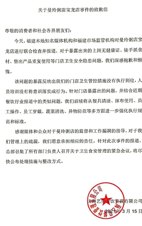 近期,記者通過暗訪發現,曼玲粥店寶龍店一些員工未佩戴好口罩,不洗手徒手抓取食材,甚至將員工吃剩的排骨洗洗再送外賣。 養生粥品質外賣受青睞 線下門店超千家 根據曼玲粥店的官方宣傳,曼玲粥連續三年為全國粥類頭部品牌,全國線下門店超千家,藝人小S還曾為ta打call。 記者在某平臺外賣點餐軟件上搜索到,曼玲粥店在福州有近二十家門店,門店的月銷量均過千單,而寶龍門店月銷量甚至超過了8000份,位居銷售榜前列。 然而,記者在這家店的評價上卻看到不少關于粥品中出現異物、食材不新鮮的內容。 到底這家自稱標桿店的衛生情況如何?記者臥底進入曼玲粥店寶龍分店一探究竟。 很快,沒有健康證且毫無經驗的記者在上班第一天直接被安排在煮粥的崗位上。 除了不需培訓直接上崗外,記者注意到有工作人員并沒有佩戴口罩,甚至在后廚吸煙。 另外,該店多位員工還習慣徒手配菜,針對該現象,記者特意留意了一段時間,發現有的員工配菜前,甚至一上午都沒洗過手。 工作人員還直接用手挑起了粥里的黑籽,他們的手指都直接跟勺子里的粥品接觸,而后,粥又被放回了鍋里。 除了“一手多用”之外,記者還注意到了一把鏟子,一會它在地上刮著污漬,沒一會又被蓋在了熬制的粥品上。 員工餐剩菜洗洗再賣給消費者 在臥底期間,最為過分的就是接下來的這個場景。 剛吃完飯的記者被阿姨安排了一個任務: 當晚的員工餐是蘿卜排骨湯,記者隨即了解到,他們這是要拿員工吃剩下的排骨洗洗再賣給消費者。 記者多次提醒勸阻,但是幾位店員似乎習以為常,并沒有叫停該行為。 甜粥使用即食罐頭,熬粥變“拌粥”? 除了以上食品安全隱患外,記者臥底曼玲粥店寶龍店期間,還發現不少甜粥產品是用罐頭調配的。 這熬粥八十分鐘,成了拌粥三分鐘。 然而該品牌打的廣告是“小圓米現熬,自然稠”。 此外,記者發現曼玲粥店華林店和首山店也存在同樣存在拿罐頭拌粥的情況。 食品安全存隱患 員工徒手配菜比比皆是 除了曼玲粥店,記者還來到了粥鋪銷量排行前列的三米粥鋪。作為知名連鎖外賣品牌,三米粥鋪如今已經在全國擁有一千多家門店,在福州市有三十多家門店。 應聘當天,經過簡單溝通,沒有健康證的記者也被安排在了幫廚的位置。米不洗就下鍋,一些員工連口罩都不戴。 店員未洗手就徒手捏皮蛋 為了圖方便,工作人員沒洗手就直接接觸食材的現象比比皆是。 該店的主打招牌是皮蛋瘦肉粥,但你知道它是怎么做成的嗎? 記者注意到,這位店員此前在經過玩手機、煮粥、炸食材等一系列動作過后,未洗手也未佩戴一次性手套,直接上手捏起了皮蛋。 曼玲粥店發布致歉信 今天,多個媒體平臺發布了相關內容,事件引發了大批網友的關注,就在剛剛!曼玲粥店官方公眾號@曼玲餐飲發出了致歉信。