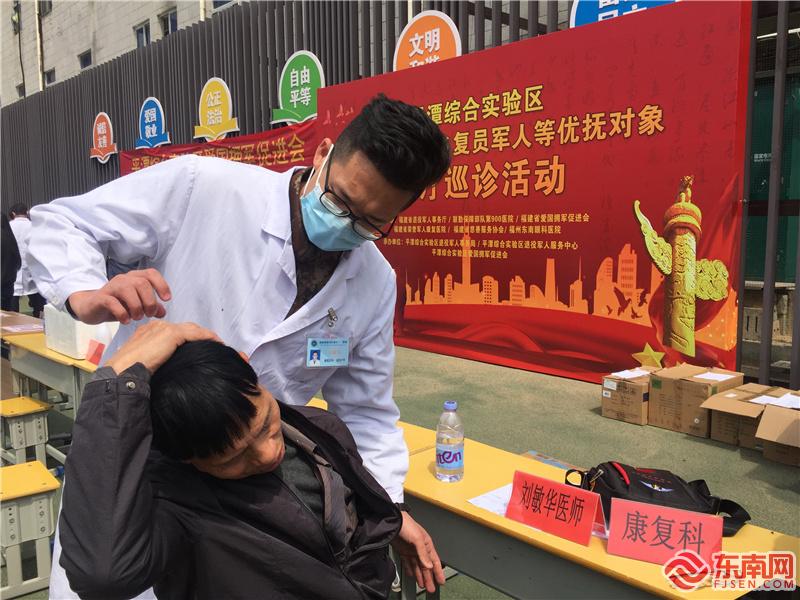 17日,在平潭人民體育場活動現場,聯勤保障部隊第九○○醫院康復科劉敏華醫生義務為退役老兵診斷。連日來,省退役軍人事務廳組織省榮譽軍人康復醫院,聯合聯勤保障部隊第九○○醫院、省愛國擁軍促進會、省慈善服務協會和福州東南眼科醫院等單位的醫療專家,從閩北山區建甌出發,經過300公里長途跋涉,首站來到素有“千島之礁”之稱的平潭,為殘疾軍人、在鄉老復員軍人和烈屬等優撫對象提供免費巡診。 省榮譽軍人康復醫院院長練畢全說:“11年來,我們每年都不間斷開展優撫對象醫療巡診活動,跋涉在山水間,風雨兼程,幾乎走遍全省各縣,已為8000多名老復員軍人和其他優撫對象提供了免費診療服務?!备=ㄈ請笥浾?何祖謀 攝影報道 |