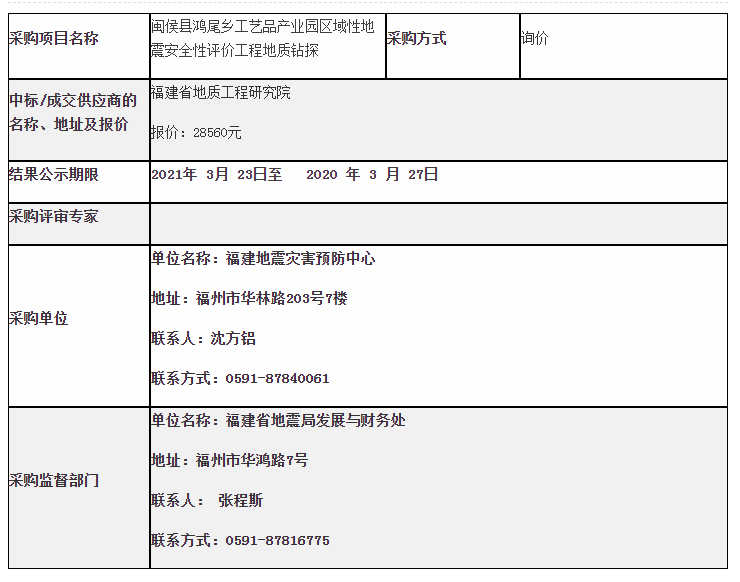 福建地震災害預防中心2021年閩侯縣鴻尾鄉工藝品產業園區域性地震安全性評價工程地質鉆探采購結果公示