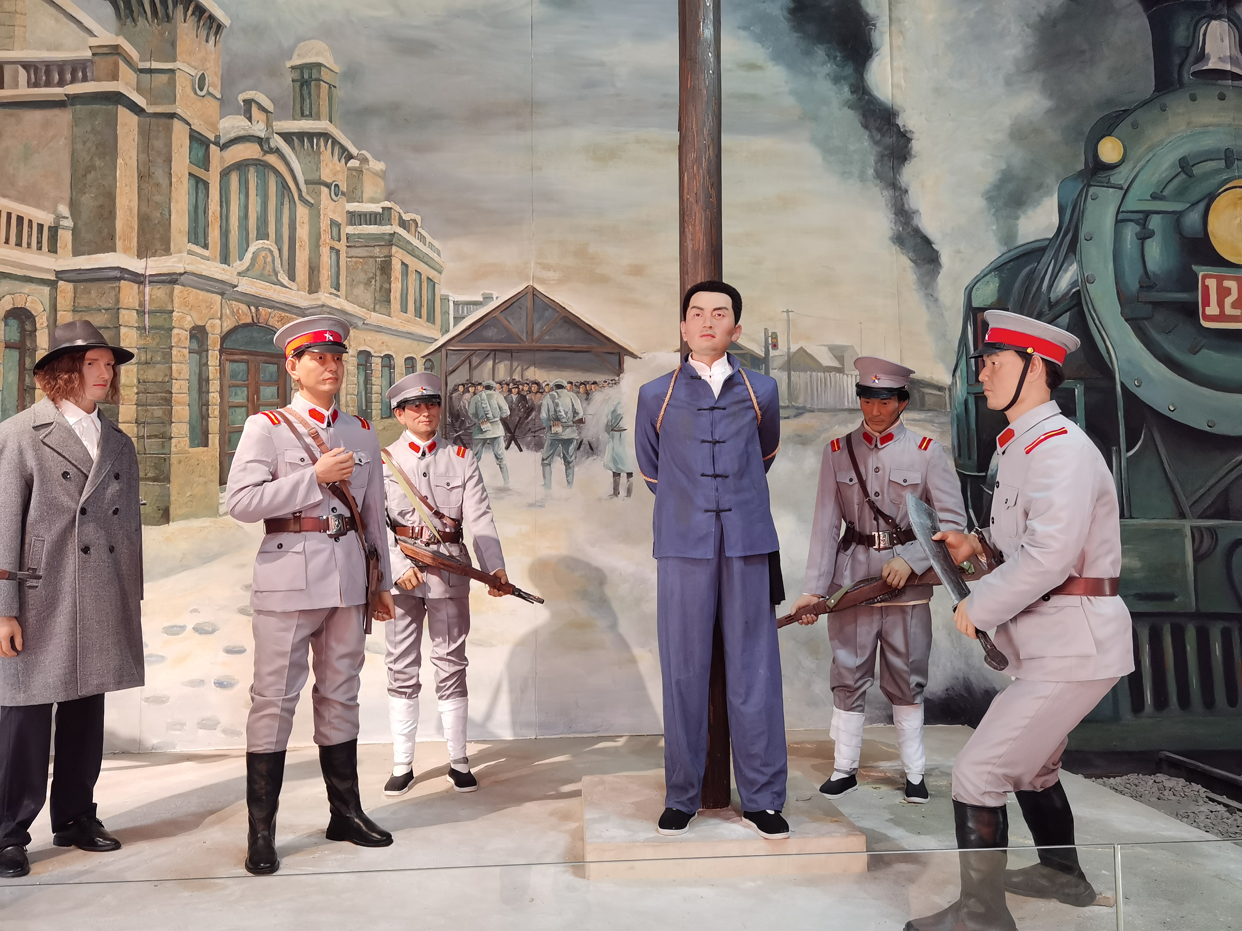 林祥謙被捆綁在車站的電線桿上(東南網記者 吳曉燕 攝) 2月7日,林祥謙帶領工人同敵人進行了殊死搏斗,因寡不敵眾,被敵人逮捕,捆綁在車站的電線桿上。敵人砍了林祥謙一刀,企圖利用酷刑逼他下復工令,林祥謙高喊:“頭可斷,血可流,工不可復!”在被劊子手砍了7刀后,林祥謙慨然就義,年僅31歲。據悉,林祥謙是有據可考的中國共產黨黨員中壯烈犧牲的第一位烈士。 重走英雄路,弘揚革命志