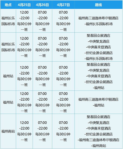 3.3 會間接駁 4月25日至4月26日,為保障參會嘉賓按時參會,將安排各指定酒店至會場的定點往返班車。 ● 4月25日海峽國際會展中心接駁安排