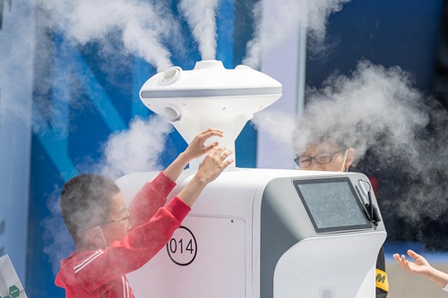 與坎德拉智能服務機器人互動??驳吕侨蚴准沂覂韧庖惑w化智能服務機器人供應商。 林熙 攝