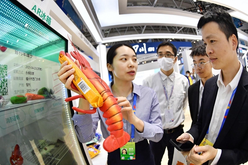 長威科技自主研發的一品一碼溯源平臺可通過AR冰箱體驗進口冷鏈食品追溯。林輝 攝