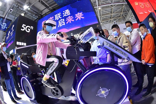 騎上5G+VR動感單車,戴上VR眼鏡,高山、平地、丘陵、河流等風光逐一呈現在眼前。林輝 攝