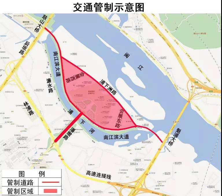 二、2021年6月18日12:00至18:00和2021年6月19日至20日每日7:00至18:00,對浦下洲路、會展東路、會展西路實行交通管制,禁止車輛(除持專用通行證車輛、公交車、出租車外)通行,南江濱大道(魁浦大橋下至鼓山大橋下)禁止所有車輛(含公交車和出租車)???。
