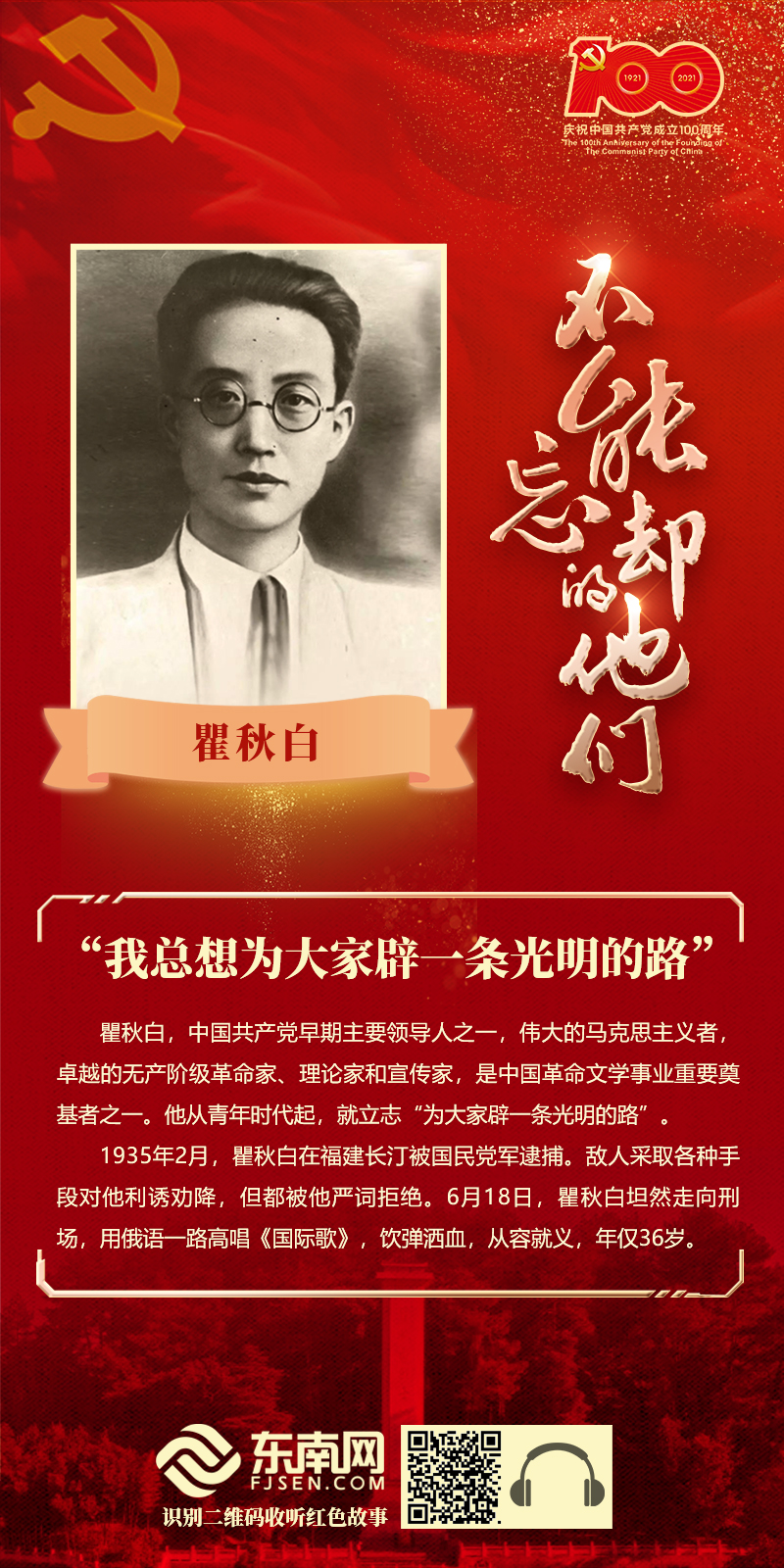 東南網6月18日訊(本網記者 林雯晶) 今年是中國共產黨成立100周年,作為中央蘇區和革命老區,福建在黨史上留下極為鮮明的印記,出現了一大批影響深刻的革命先烈。其中,有在閩犧牲的無產階級革命家,有全國工農群眾運動的先驅,有戰斗在抗敵第一線的先鋒斗士,有致力于蘇維埃政權建設的紅色楷?!?/p> 天地英雄氣,千秋尚凜然。東南網聚焦在閩犧牲或福建籍革命先烈,特別策劃推出“不能忘卻的他們”系列融媒體產品。產品采用全新的形式,每期均由人物稿件和有聲海報組成,網友可以邊看邊聽,讓革命先烈故事“聲”入人心,從先輩身上汲取源源不斷的奮進力量。 86年前的今天,中國共產黨早期主要領導人之一、偉大的馬克思主義者、卓越的無產階級革命家瞿秋白在龍巖長汀慷慨就義。在這個特別的日子,東南網推出本系列第一期《瞿秋白:“為大家辟一條光明的路”》,共同緬懷這位卓越的無產階級革命家,重溫瞿秋白同志“生如夏花之絢爛,死如秋葉之靜美”的一生。 紀念是為了更好地前行,“不能忘卻的他們”系列產品還將陸續推出林祥謙、何叔衡、吳石、蔡威等革命先輩的紅色故事,與網友一道致敬歷史,傳承紅色基因,為實現中華民族偉大復興中國夢而不懈努力!