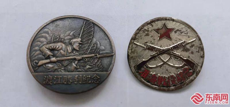 1949年中國人民解放軍華東軍區頒發的“渡江勝利紀念章 ”和“淮海戰役紀念章”,尚智勛老人視若珍寶。(受訪者供圖)