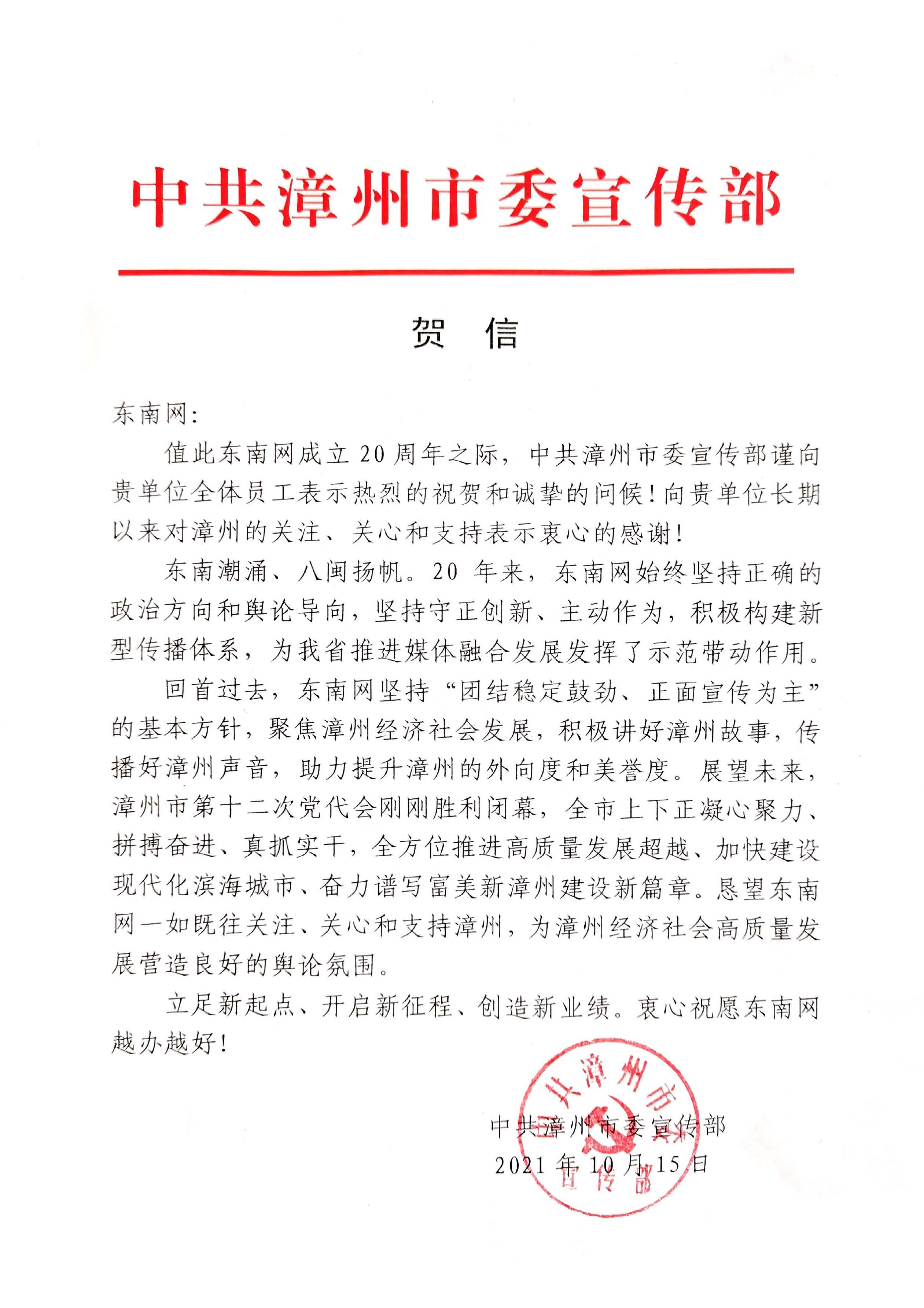 中共漳州市委宣傳部賀信
