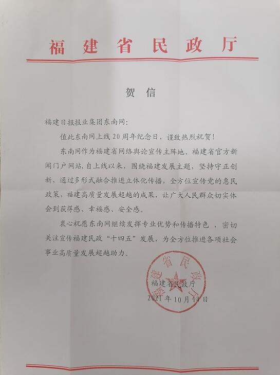 福建省民政廳賀信