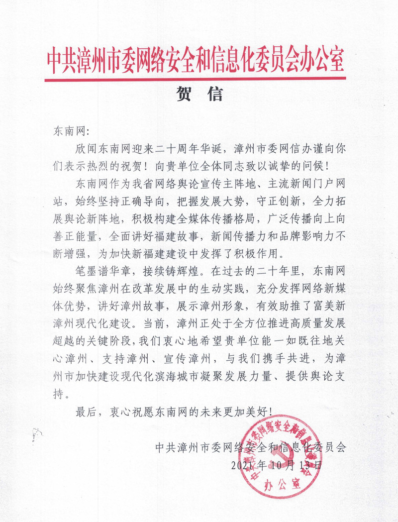 中共漳州市委網絡安全和信息化委員會辦公室賀信