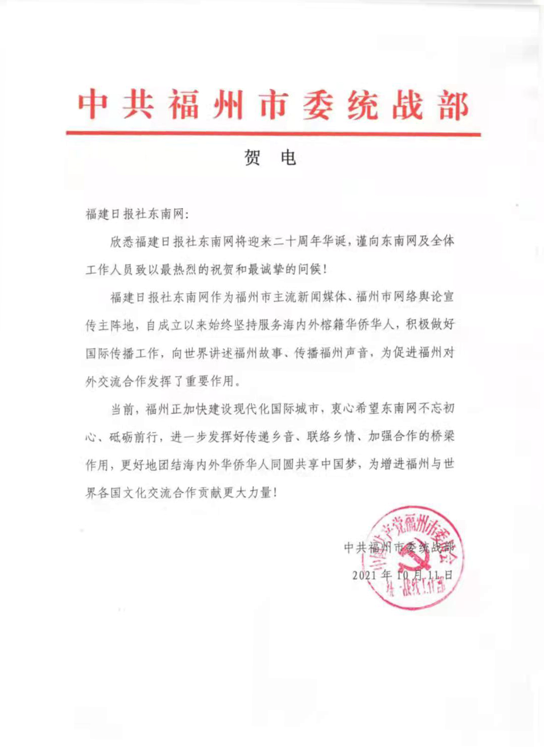 中共福州市委統戰部賀信
