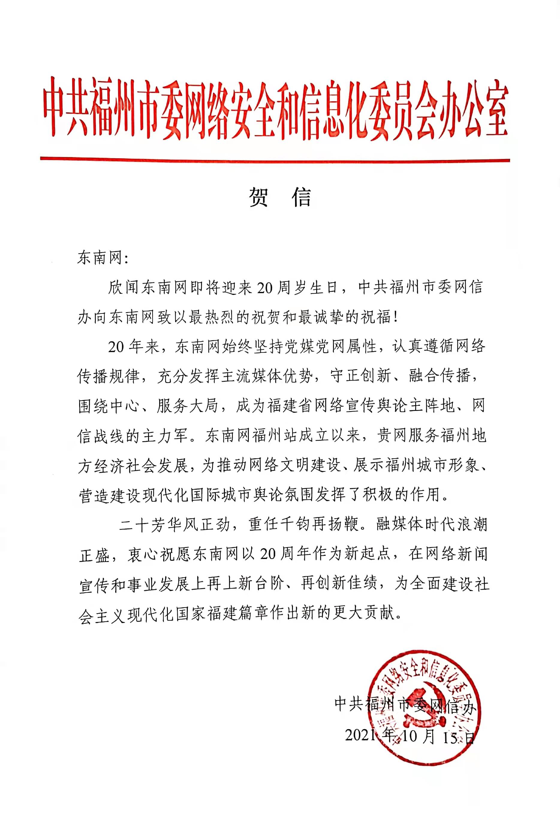 中共福州市委網絡安全和信息化委員會辦公室賀信