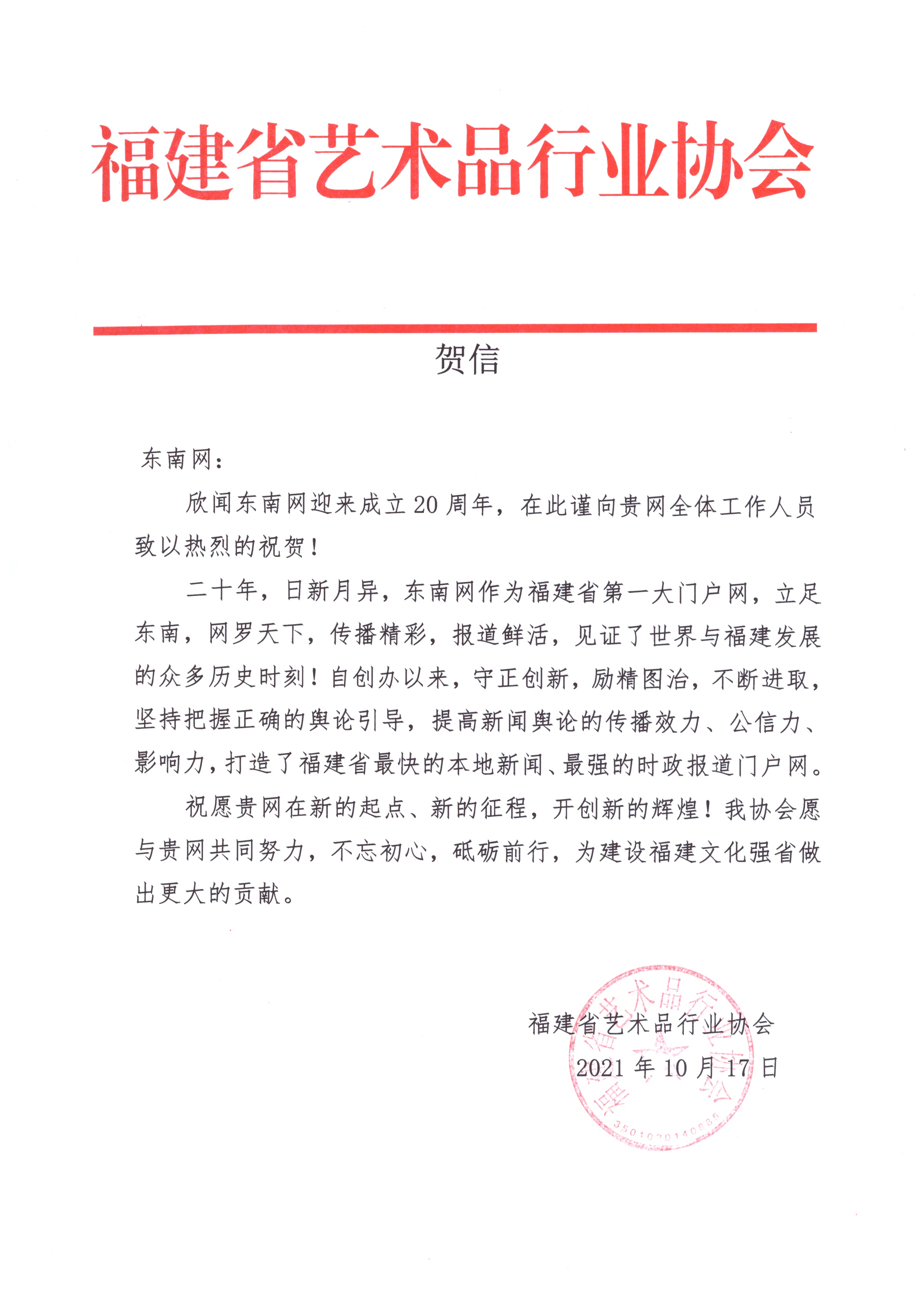 福建省藝術品行業協會賀信