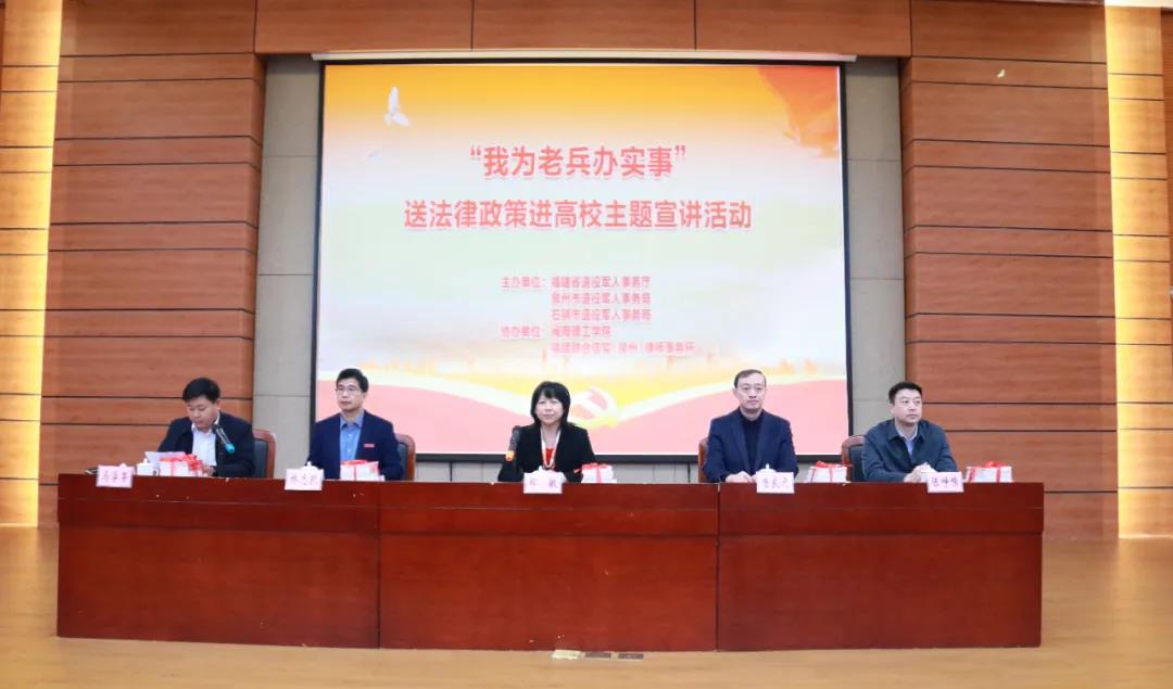 12月6日上午,由福建省退役軍人事務廳、泉州市退役軍人事務局和石獅市退役軍人事務局聯合舉辦的“我為老兵辦實事”法律政策進高校主題宣講活動在閩南理工學院舉行。省退役軍人事務廳副廳長鄭敏出席并致辭。泉州市退役軍人事務局、石獅市退役軍人事務局和閩南理工學院等相關領導參加活動。