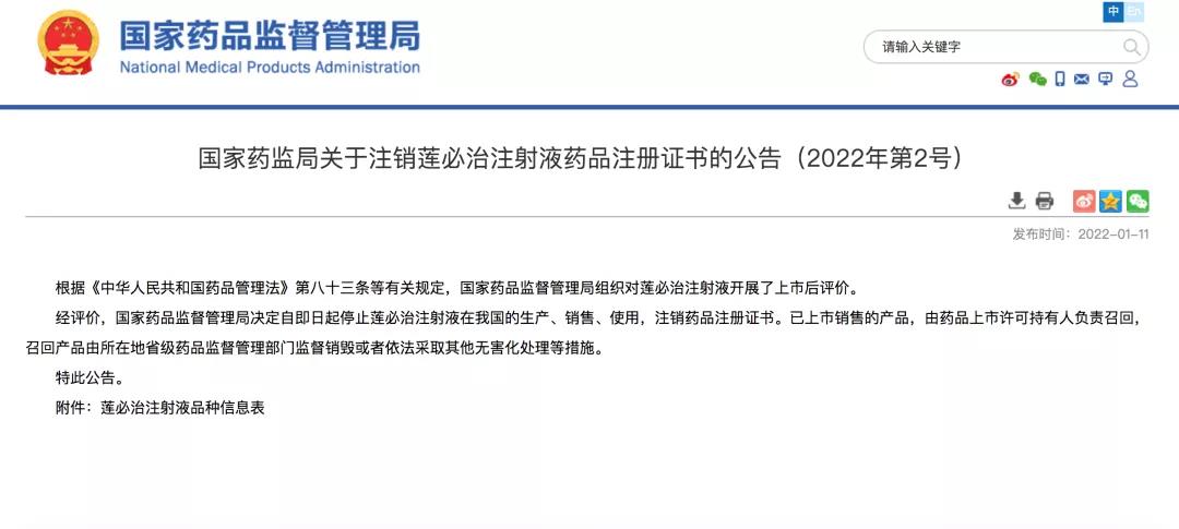 1月11日,國家藥監局發布公告,即日起停止蓮必治注射液在我國的生產、銷售、使用,注銷藥品注冊證書。