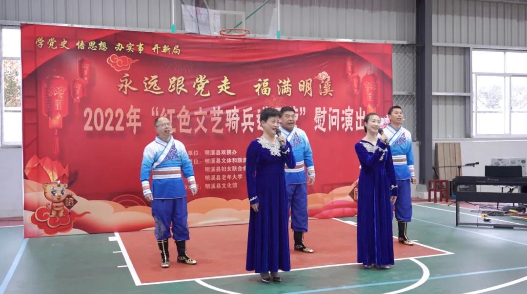 1月22日,由三明市明溪縣雙擁辦、縣委宣傳部主辦,縣文旅局、縣退役軍人事務局、縣婦聯、縣文聯、縣老年大學協辦的“永遠跟黨走·福滿明溪”2022年“紅色文藝騎兵進軍營”慰問演出在明溪縣武警中隊訓練館成功舉辦。