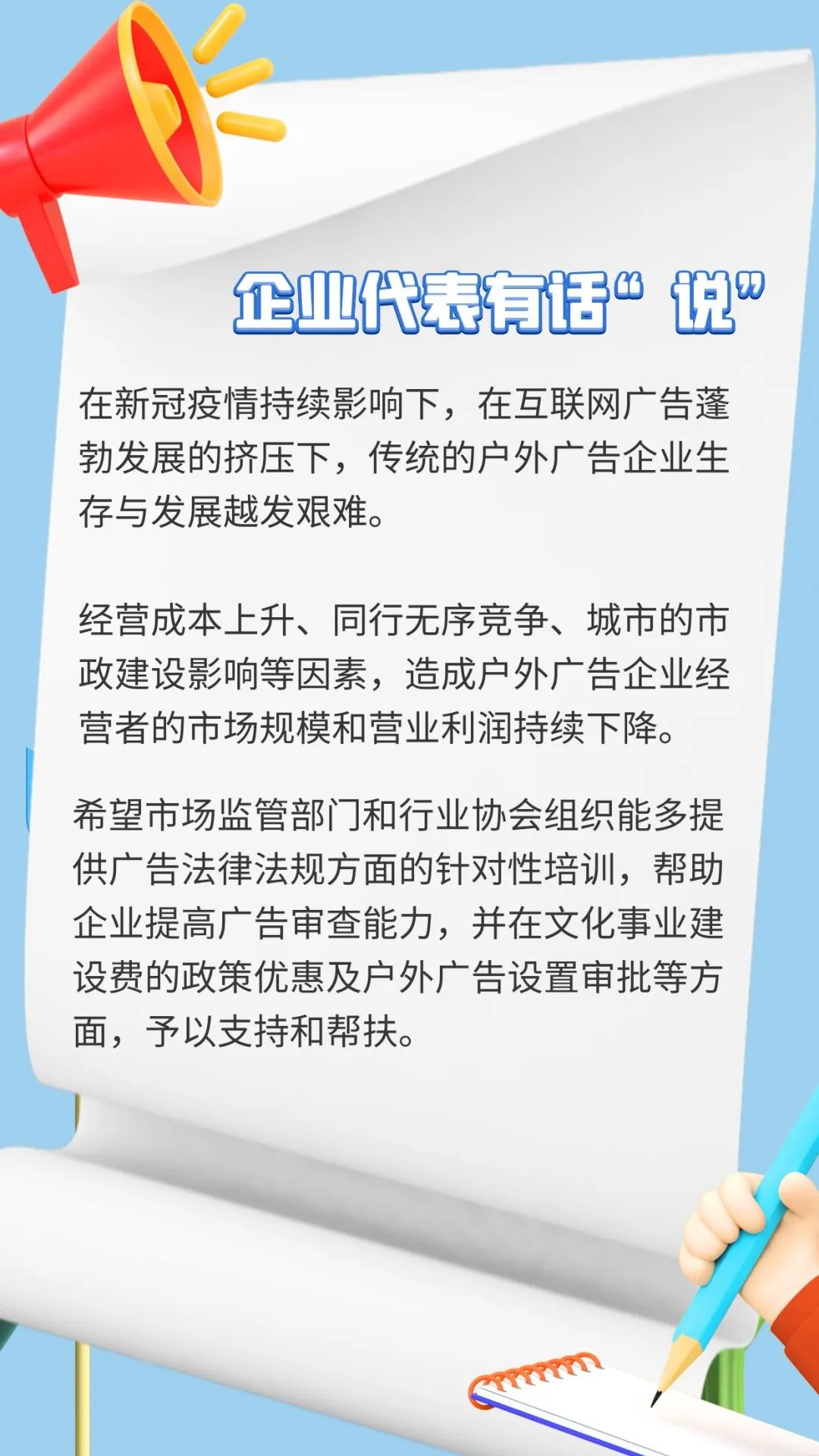 參會企業人員表示,由市場監管部門組織舉辦專場的戶外廣告座談,對后疫情環境下處于艱難發展的戶外廣告企業可謂是雪中送炭,這個座談會開得及時有針對性,希望市場監管部門多多搭建這樣的指導行業發展的平臺,建立高效的政企聯動綠色通道,助推行業健康發展。