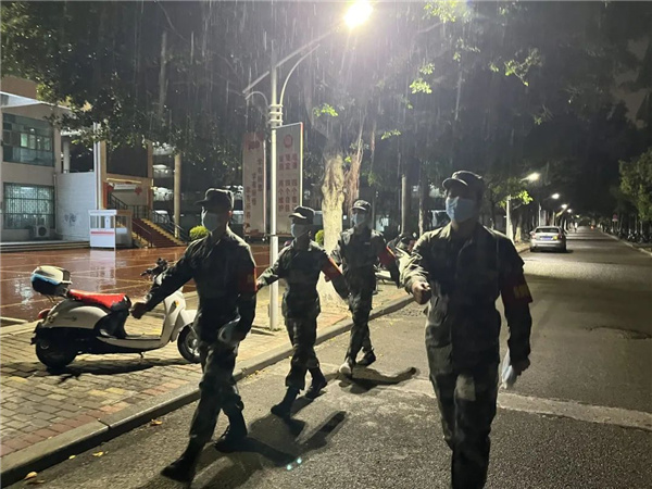 每一名退役士兵 肩上都扛著一份沉甸甸的責任 “若有戰,召必回” 寒冷的雨夜里 他們的身影穿梭在校園中 默默守護著大家 雨夜堅守 不懼困難