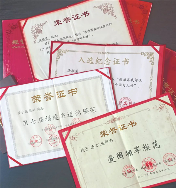 △湯萬叢、湯順榮父子倆榮獲的部分榮譽證書 一句承諾 穿過古色的涵洞,踏著青石條板,可領略到水南渡口舊日的忙碌與繁盛,金溪河波光粼粼,無聲地流向遠方?!熬褪窃谶@里,當年秦福河烈士被我父親抬上來?!闭驹诙煽谶吷系臏槝s指著金溪河上游不遠處的水面說。 時間追溯到1950年初,剛解放不久的將樂縣周邊,國民黨殘兵敗將與地方土匪武裝狼狽為奸,為非作歹,經常攪得四鄰八鄉雞犬不寧。 當時,年僅14歲的湯萬叢跟隨其父湯七根在水南渡口擺渡謀生。4月的一天上午,因連降暴雨,金溪河水暴漲。湯萬叢獨自在水南渡口替父親照看竹排。突然,他發現河上游漂來一個不明“物體”,連忙舉起搭鉤朝那物體探去??拷豢?,大吃一驚,原來是一具身著淺黃色軍裝的遺體,再細看,鋼盔內的軍帽上綴著一顆紅色五角星。啊!原來是解放軍叔叔! 想起不久前,自己撐竹排送過一批又一批解放將樂、過河進城的解放軍,他們個個英姿勃發,態度親切和藹,對老百姓像對待自己的親人一樣。想到這里,湯萬叢不再害怕,他縱身跳入河中,使出渾身力氣將遺體朝岸邊推去,拉到岸邊樹林中隱藏起來,然后跑去找父親。 湯七根正在河對岸的縣城買豬肉,聞訊匆忙趕到河岸邊。父子倆在遺體的軍衣口袋里發現了一個小記事本,上面寫著:秦福河,25歲,山東省五蓮縣人,中國人民解放軍步兵第二八七團三營八連戰士。湯七根對兒子說:“解放軍就是當年打土豪、分田地的紅軍,我見過,個個都是好人。這位解放軍戰士大老遠從山東來,幫咱們打土匪,讓我們過上太平日子。如今,他英勇犧牲,我們就是他的親人,要找個地方讓他入土為安?!?/p> 就這樣,湯七根拿出為自己準備的棺木,冒著被土匪報復的危險,秘密把這位素不相識的解放軍戰士秦福河安葬在金溪河畔自家的菜地里。 轉眼過了中秋,閩贛粵三省交界進行大規模剿匪,土匪被解放軍一網打盡。想到烈士匆匆下葬,一家人滿懷歉意。于是,湯七根湊足錢,從縣城請來石匠,選用本地最好的“龍池硯石”打制墓碑,把從烈士小記事本上抄下來的內容全都刻在墓碑上,并在墓碑的正上方刻上一顆紅五角星,按照當地風俗重新給烈士修墳立碑安葬。 1958年春,湯七根臨終前特意叮囑兒子湯萬叢把自己埋到烈士身邊,別讓烈士孤單了。遵從湯七根的囑咐,湯萬叢把父親葬在了烈士墓旁,年年不忘祭祀。 為烈士尋親 改革開放后,百姓富起來了。每年清明,湯萬叢祭祀秦福河烈士的供品也多了起來,有豬肉、烤鴨、河魚、水果和自家釀的米酒。他常跟子女說:“烈士是為我們打土匪犧牲的,我們今天的好日子是他們用生命換來的。他犧牲在我們這里,就是我們的親人,理所當然要盡親人的情分和義務?!?/p> 后來,村里有人在秦福河烈士墓附近蓋房子,建豬圈,一到下雨天,污水便流入秦福河烈士的墓地。湯萬叢見了心疼,寢食難安。為解決這樁心事,1990年12月12日,他決定為烈士遷墳。將樂縣民政部門得知此事,被他的真情所感動,便從安置優撫金中劃出300元,支持這一義舉。 很快,湯萬叢在水南的龍燈山選好一塊地,帶領全家人重新為烈士修墳立碑安葬。 修好烈士新墳當天,湯萬叢要湯順榮記?。骸拔覀円患矣肋h都是秦福河烈士的親人,今后不管再苦再難,你們也要像我和你們的爺爺一樣,守護好烈士墓?!?/p> 2007年,縣里倡導殯葬改革,在將樂縣民政部門的支持下,秦福河烈士墓被遷到天閣陵園革命烈士墓區。革命烈士墓區雖然有專人管護,但湯萬叢父子倆年年清明節依然前往祭掃秦福河烈士墓。 湯萬叢義葬英烈、長年堅持祭掃烈士墓的感人故事在將樂大地傳開后,成為佳話。2009年7月,湯萬叢被福建省委、省政府、省軍區授予“愛國擁軍模范”榮譽稱號。 為秦福河烈士尋親,一直是湯萬叢的心愿。將樂縣民政部門得知湯萬叢心事后,多次幫助函查,終于查到秦福河烈士有一個親生女兒叫秦洪花居住在天津。聽到這一消息后,湯家人激動不已。 2007年9月28日,秦福河烈士的女兒秦洪花專程從天津來到將樂,祭拜父親,看望和感謝湯萬叢一家人。那天,當秦洪花和她兒子陳波見到湯萬叢時,感動地說:“我們就當您是親舅舅、親舅公了。舅舅、舅公!57年了,這一刻終于盼來了……”母子倆淚如雨下,湯萬叢也老淚縱橫。隨后,兩地親人手捧鮮花,齊刷刷地跪在秦福河烈士墓前祭拜,告慰烈士在天之靈。 當秦洪花含淚告別時,湯萬叢再三安慰她說:“老妹,你住在天津,來往一趟很不容易,我們現在就是一家人,祭掃的事就交到我手上,你就放一百個心吧,我們會世世代代傳承下去的!” 傳承之美 “父親在世時反復對我說,要守好烈士墓,我們的好日子,都是無數革命先烈用生命換來的。長大后,我就越來越明白這個道理,不僅要去做好這件事,還要讓子孫后代也傳承下去,因為我們不能忘記歷史,幸福真的來之不易?!?/p> 受秦福河烈士和家人的影響,湯順榮于1995年入伍,圓了自己當一名軍人的夢想。1998年,湯順榮從部隊退伍還鄉,接過年邁父親手中的“接力棒”,繼續守護好秦福河烈士墓,不僅清明節必去祭掃,每逢“八一”建軍節也要去為烈士獻花,清掃落葉、拂去灰塵,為烈士墓碑描紅。 想到秦福河等無數先烈為人民英勇獻身,以及祖輩、父輩的教誨,這些寶貴的精神財富、無形的力量,化為湯順榮為人處世的基礎和干事創業的動力。 2012年,湯順榮開始自籌資金創業,創辦了一家水泥制品小作坊,主要生產新型環