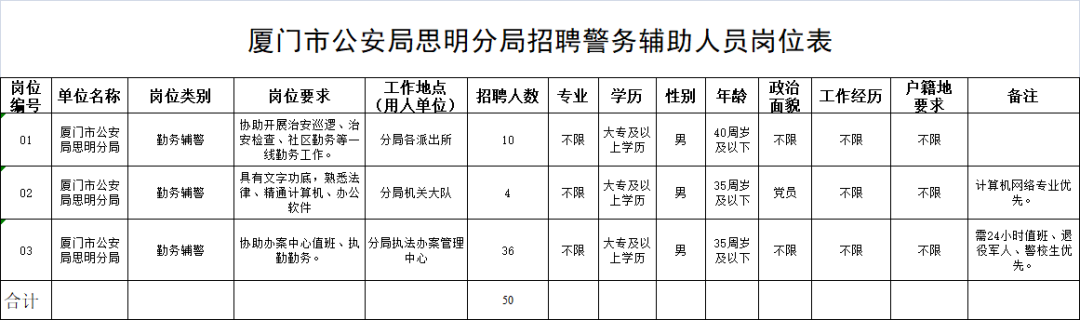 因工作需要 廈門市公安局思明分局、湖里分局 現面向社會公開招聘 133名警務輔助人員 1名后勤人員 劃重點!快來get↓↓ 廈門市公安局思明分局招聘 警務輔助人員50名 一、招聘崗位及條件 1、招聘崗位: