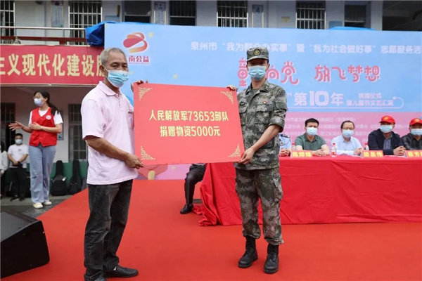 5月27日,“童心向黨放飛夢想”——東南公益“愛心午餐”第10年捐贈儀式暨兒童節文藝匯演在泉州安溪縣劍斗鎮潮碧小學舉行,中國人民解放軍73653部隊和來自社會各界的愛心人士,帶著精心準備的節日禮物,陪伴71名學生們提前歡度兒童節。