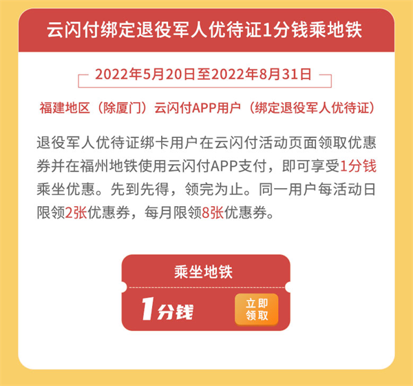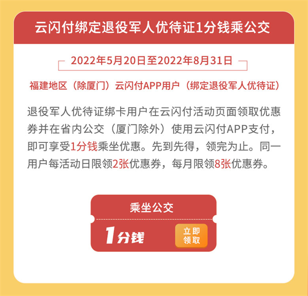 退役軍人尊享,致敬最可愛的人。福建銀聯在“云閃付”APP上開設了優待證“優惠+活動”專區,專區是優待證持有人專享,符合要求的持卡人使用“云閃付”APP綁定優待證后,可以在“云閃付”APP活動頁搶各類優惠券,并在線上和線下掃碼自動核銷使用?!霸崎W付”APP綁定優待證后,可搜索“優待證”進入專區,查看各類權益,包括銀聯、銀行以及合作單位提供的各類擁軍優撫權益等: 基礎權益包含線下消費場景(超市便利、餐飲美食、公交地鐵、加油等)享受立減優惠;線上購物(京東、美團、拼多多、樸樸、永輝等100多個線上APP)支付立享優惠。每人每月最高可省188元。 專屬權益包含1分錢乘公交。在5月20日到8月31日期間,退役軍人優待證綁卡用戶在云閃付活動頁面領取優惠券并在全省公交(廈門除外)使用。單用戶單日限優惠2次,單月限優惠8次,先到先得,用完為止。 1分錢乘地鐵。在5月20日到8月31日期間,退役軍人優待證綁卡用戶在云閃付活動頁面領取優惠券并在福州地鐵使用。單用戶單日限優惠2次,單月限優惠8次,先到先得,用完為止。 銀聯點亮假日·退役軍人專享季。5月20日至7月31日期間,退役軍人優待證綁卡用戶在云閃付活動頁面領取優惠券后,在樸樸APP、永輝生活 APP上使用“云閃付”APP支付,可享滿10元62折優惠(最高優惠10元),先到先得,領完為止。同一持卡人每活動日可限領1張優惠券,每月限領4張優惠券。 優惠活動會動態更新,請關注“云閃付”APP上最新活動信息。 云閃付注冊及綁卡操作 第一步