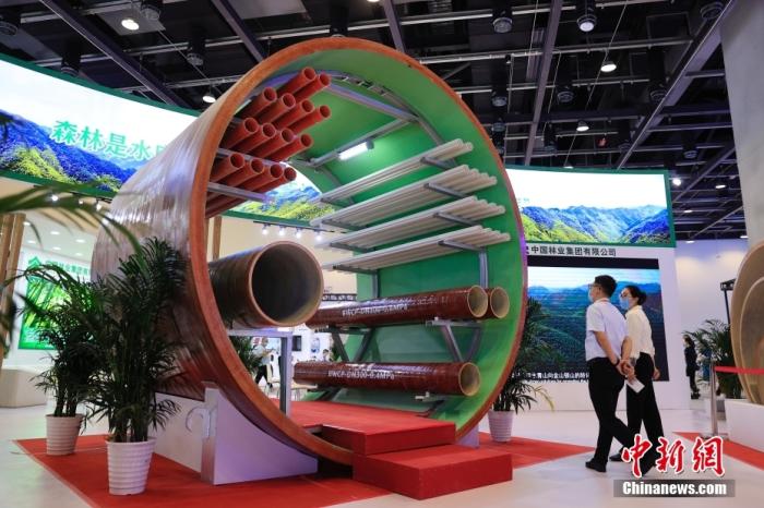在服貿會國家會議中心展區的環境服務展區,工作人員向觀眾介紹竹纏繞復合管。 中新社記者 韓海丹 攝