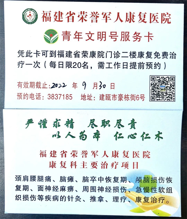 秋天,是金色光芒的閃耀,是耕耘奉獻的收獲。當九月如期而至,金秋的時光像跳動的音符充滿了快樂,今年,恰逢第38個教師節和中秋節為同一天,尊師重教是中華民族的優良傳統,教師傳道授業解惑被尊稱為人類靈魂的工程師,而中秋節本就象征著團圓美好,在這樣一個特殊的日子里,福建省榮譽軍人康復醫院康復科將以免費發放診療卡的方式為各大、中、小、幼老師提供義務診療活動,具體活動實施方案如下: 一、活動主題: “尊師重教 喜樂團圓” 二、活動時間: 免費發放診療卡時間:9月6日—9月9日 就診時間:9月6日—9月30日 三、具體活動安排: 1、各位教師憑教師證并關注“福建省榮譽軍人康復醫院”公眾號,到門診二樓康復科登記領取就診卡,一人2張,限量60張。 2、醫生視每個人存在的病癥不同,有針對性地提供針灸、推拿、康復鍛煉、理療等治療項目。 四、注意事項: 1.診療卡需在規定的領取時間內發放及領取,數量有限,領完為止。 2.如本人沒時間就診,診療卡可轉贈家人及朋友。 3.診療卡只能在指定時間內使用,過期無效。 4.一張診療卡只能使用一次,就診后請交于工作人員處。 診療卡如下圖所示