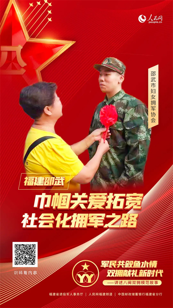 “軍愛民、民擁軍,軍民魚水一家親?!备=?,是全國唯一所有設區市連續五屆獲評雙擁模范城(縣)的省份,一個個軍愛民、民擁軍的生動故事在八閩大地不斷涌現。為唱響閩山閩水間的“愛我人民愛我軍”軍民情主旋律,福建省退役軍人事務廳聯合人民網福建頻道、中國郵政儲蓄銀行福建省分行共同推出“軍民共敘魚水情 雙擁獻禮新時代”主題宣傳活動,從“新時代八閩雙擁故事”看福建如何續寫新征程上的雙擁新篇章。 本期嘉賓:福建省邵武市婦女擁軍協會會長伍夏云