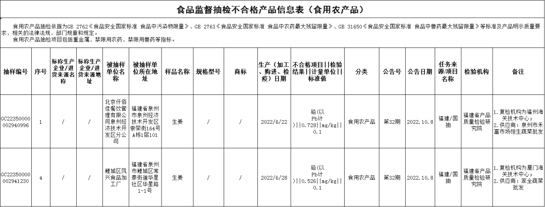 重金屬污染問題:北京仟佰佳餐飲管理有限公司泉州經濟技術開發區分公司銷售的生姜(購進日期為2022年6月22日),鉛(以Pb計)不合格,初檢機構為福建省產品質量檢驗研究院,復檢機構為福州海關技術中心;鯉城區鳳興食品加工廠銷售的生姜(購進日期為2022年6月28日),鉛(以Pb計)不合格,初檢機構為福建省產品質量檢驗研究院,復檢機構為廈門海關技術中心。