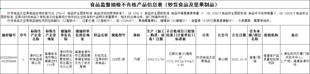質量指標問題:漳州億來財食品有限公司2021年11月20日生產的彩虹花生(堅果和籽類食品),過氧化值(以脂肪計)不合格,銷售單位為漳州市恒晟商貿發展有限公司云霄元光分公司,初檢機構為福建省產品質量檢驗研究院,復檢機構為廈門海關技術中心。