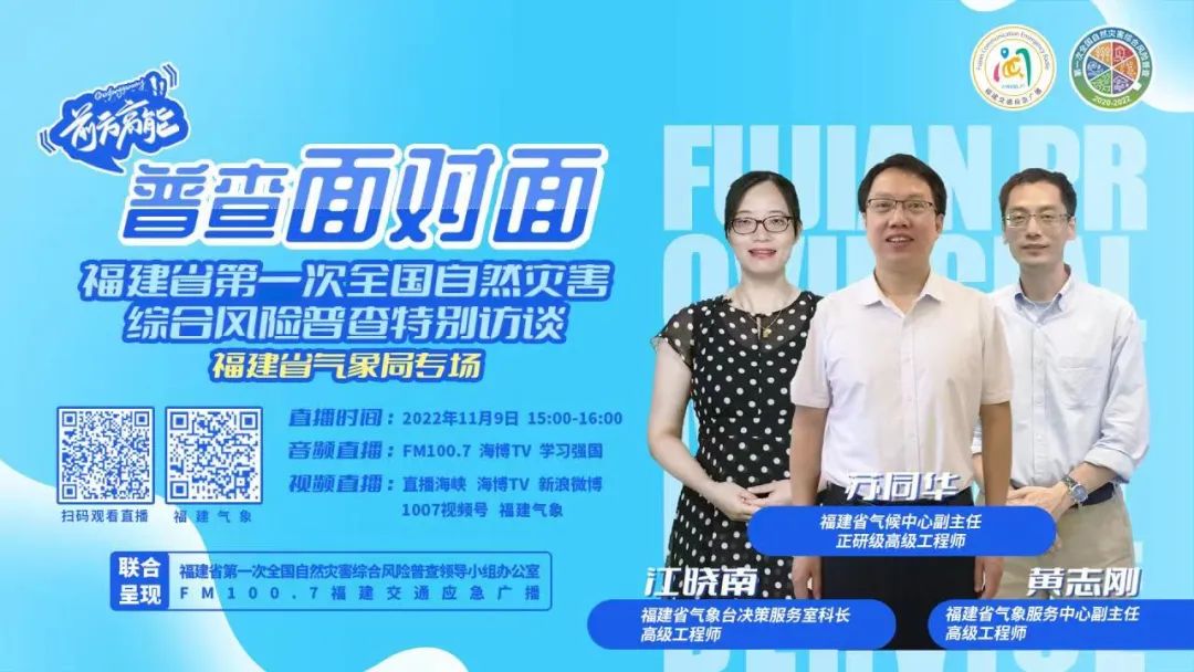 11月9日,福建省氣候中心副主任、正研級高級工程師蘇同華,福建省氣象服務中心副主任、高級工程師黃志剛,福建省氣象臺決策服務室科長、高級工程師江曉南,三位氣象專家,做客1007福建交通應急廣播的《前方高能》之《普查面對面》欄目,就福建省氣象局在第一次自然災害綜合風險普查中的工作與聽友網友進行了分享。