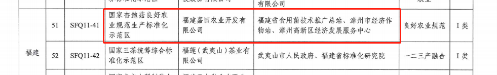 日前,國家標準化管理委員會發布了《關于下達農業農村及新型城鎮化領域標準化試點示范項目的通知》(國標委發〔2022〕50號),漳州市市場監督管理局指導推薦的福建嘉田農業開發有限公司獲批承擔“國家杏鮑菇良好農業規范生產標準化示范區”建設,長泰區農業農村局獲批參與“數字鄉村建設”試點。