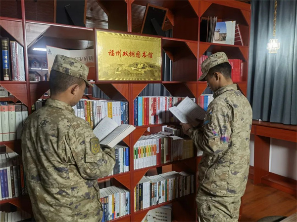 部隊官兵在“福州雙擁圖書館”閱讀 該部營區地處年楚河流域,海拔4000米之上,常年高寒缺氧,屬三類艱苦邊遠地區。戍邊官兵在條件十分艱苦的情況下,堅守雪域邊疆,守衛祖國前哨。福州市切實發揮全國雙擁模范城榜樣示范作用,投入230萬元建設提升部隊文體設施。2023年,為進一步服務官兵所需,豐富官兵精神文化生活,與部隊在高原營區共建圖書館。該圖書館的正式掛牌,標志著全國海拔最高雙擁圖書館暨軍營郵政集郵文化展示館——“福州雙擁圖書館”的正式投用,也標志了福州“情系邊海防”擁軍優屬系列活動一項重要工作的順利完成。