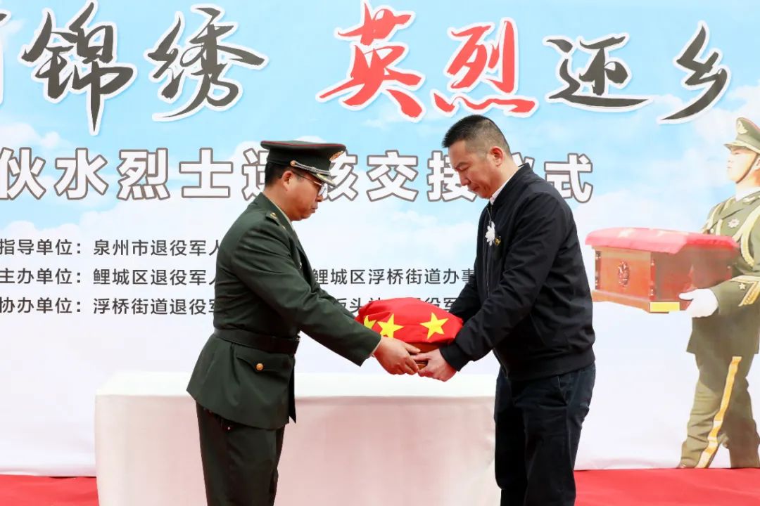 山河錦繡,英烈還鄉;寒風瑟瑟,哀思綿綿。2月21日上午,鄭伙水烈士遺骸交接儀式在泉州市鯉城區浮橋街道坂頭社區舉行。當地以莊嚴肅穆的儀式,送英雄魂歸故里!當天,鄭伙水烈士遺骸迎歸儀式在福州舉行。這是新修訂的《烈士安葬辦法》施行后,我省首場按照新規定舉辦的烈士遺骸交接、迎歸儀式。