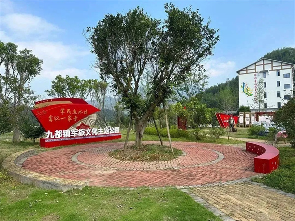 九都軍旅文化館位于九都鎮九仙村九仙館一樓,館內基本陳列分為國防教育知識、雙擁工作展示區、九都鎮革命遺跡遺址、九都鎮烈士譜以及參軍入伍軍功榮譽墻等五個部分,以形象生動的文字和圖畫再現了土地革命、抗日戰爭、解放戰爭時期九都鎮犧牲的英烈事跡和近年來九都鎮黨委政府全面推進深化雙擁共建工作的真實歷程,詮釋了軍政軍民“同呼吸、共命運、心連心”的魚水深情。 館外九仙花苑門樓左側還有一座軍旅文化主題公園,九都鎮通過設置連排立式宣傳展板和銅人雕塑等形式,詳細展示了鎮域紅色旅游路線、革命故事、旅游景點等內容,將雙擁文化與自然環境融為一體,吸引了眾多市民駐足打卡。